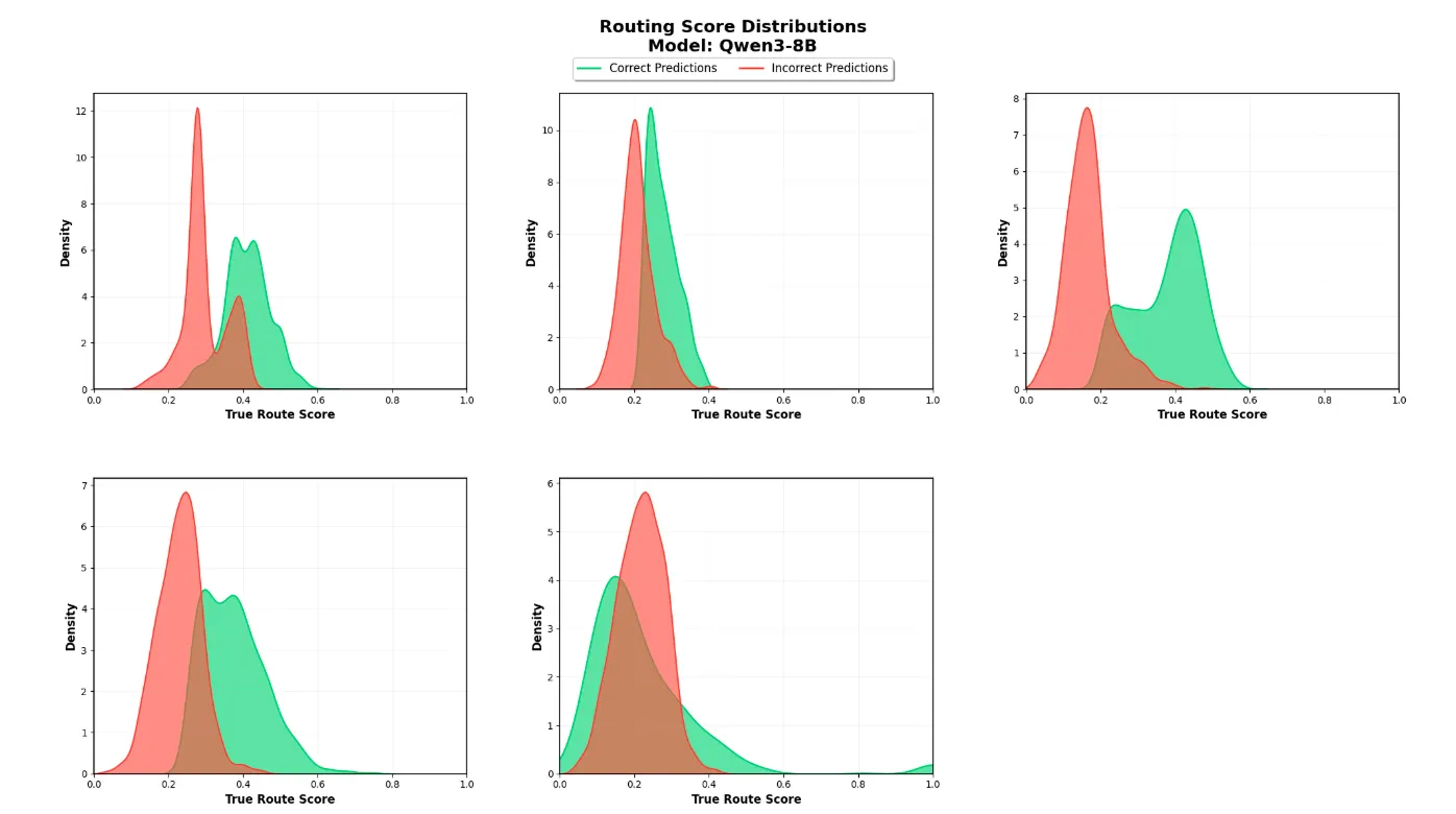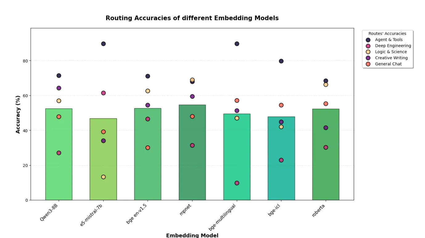 The compact all-mpnet-base-v2, a fast, lightweight model designed for dialogue similarity, delivered the highest average accuracy at approximately 58%. Close behind was Qwen3-Embedding-8B at 55%. Meanwhile, the BGE family, which dominates standard retrieval benchmarks and classification tasks, plummeted to 49–51% on our routing task. In contrast, Qwen3-Embedding-8B maintained a healthy 65% accuracy on Deep Engineering while preserving clean separation from Agents & Tools. Analysis of the cosine similarity distributions (Figure 2) reveals why. For four of five routes, correctly routed prompts cluster at similarities of 0.4–0.6, while incorrect routes cluster at 0.2–0.3, indicating strong intrinsic discriminability. Only General Chat inverted this pattern, showing lower similarities for correct assignments—a mathematical signature of its role as a fallback for prompts that fail to match any specialist route.
