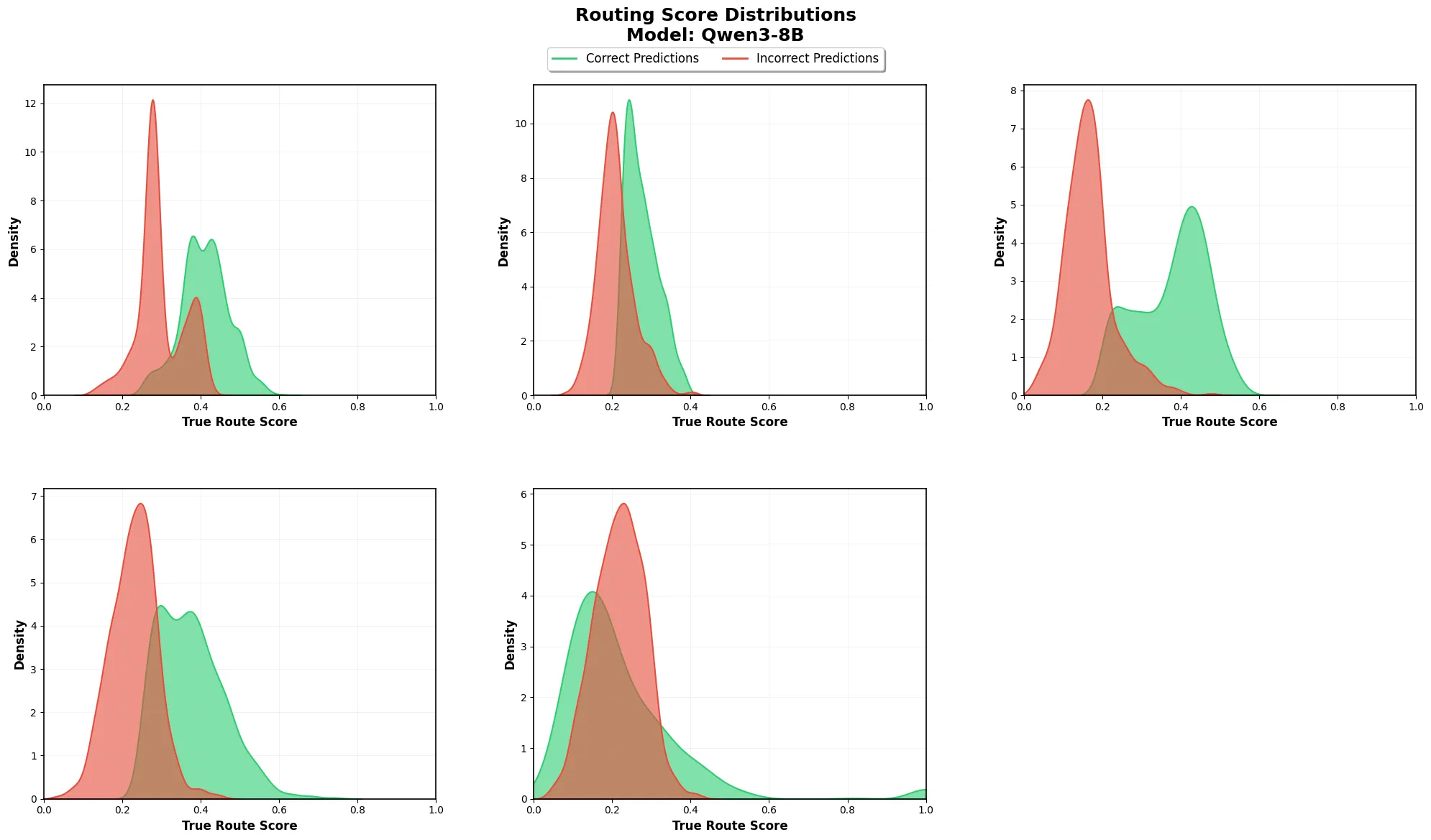 The compact all-mpnet-base-v2, a fast, lightweight model designed for dialogue similarity, delivered the highest average accuracy at approximately 58%. Close behind was Qwen3-Embedding-8B at 55%. Meanwhile, the BGE family, which dominates standard retrieval benchmarks and classification tasks, plummeted to 49–51% on our routing task. In contrast, Qwen3-Embedding-8B maintained a healthy 65% accuracy on Deep Engineering while preserving clean separation from Agents & Tools. Analysis of the cosine similarity distributions (Figure 2) reveals why. For four of five routes, correctly routed prompts cluster at similarities of 0.4–0.6, while incorrect routes cluster at 0.2–0.3, indicating strong intrinsic discriminability. Only General Chat inverted this pattern, showing lower similarities for correct assignments—a mathematical signature of its role as a fallback for prompts that fail to match any specialist route.